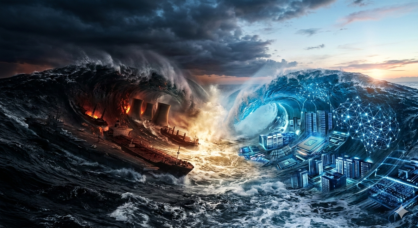 For policymakers, the imperative is starkly different: work to compress the barbell. Invest in the institutions, agreements, and infrastructure that rebuild some version of the productive middle — not as nostalgia for a world that no longer exists, but as the architecture of one that might. The waves have collided. The question is whether we build something new in the wreckage, or simply ride the extremes until one of them overwhelms us.